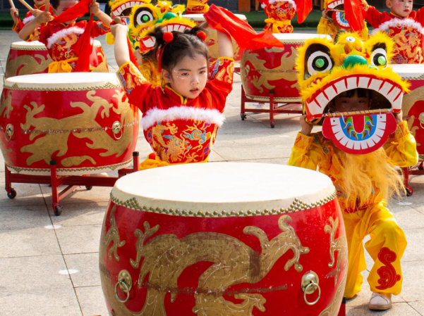 國家能源集團(tuán)愛心幼兒園的孩子們表演打鼓、舞獅 (朱澤雅 攝)