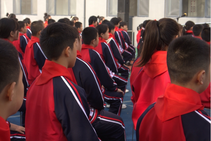 戴著紅領(lǐng)巾的小學(xué)生們坐在國家能源集團愛心學(xué)校的操場上 (朱澤雅 攝)