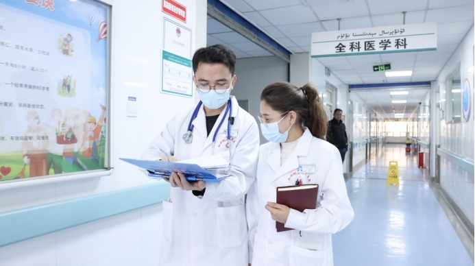 圖為阿布迪熱合曼·圖爾蓀(左)和同事一起討論查房情況