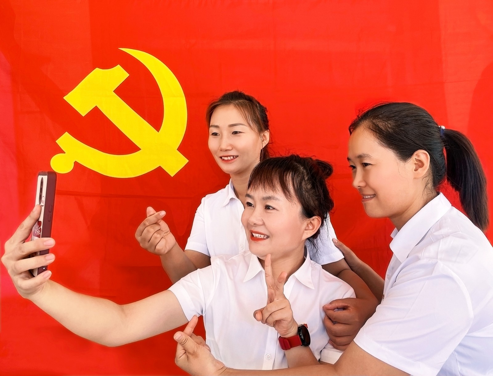 圖為黨員正在和黨旗合影