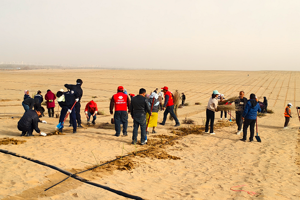 圖為“護(hù)綠先鋒隊(duì)”挺進(jìn)沙漠植樹(shù)現(xiàn)場(chǎng)