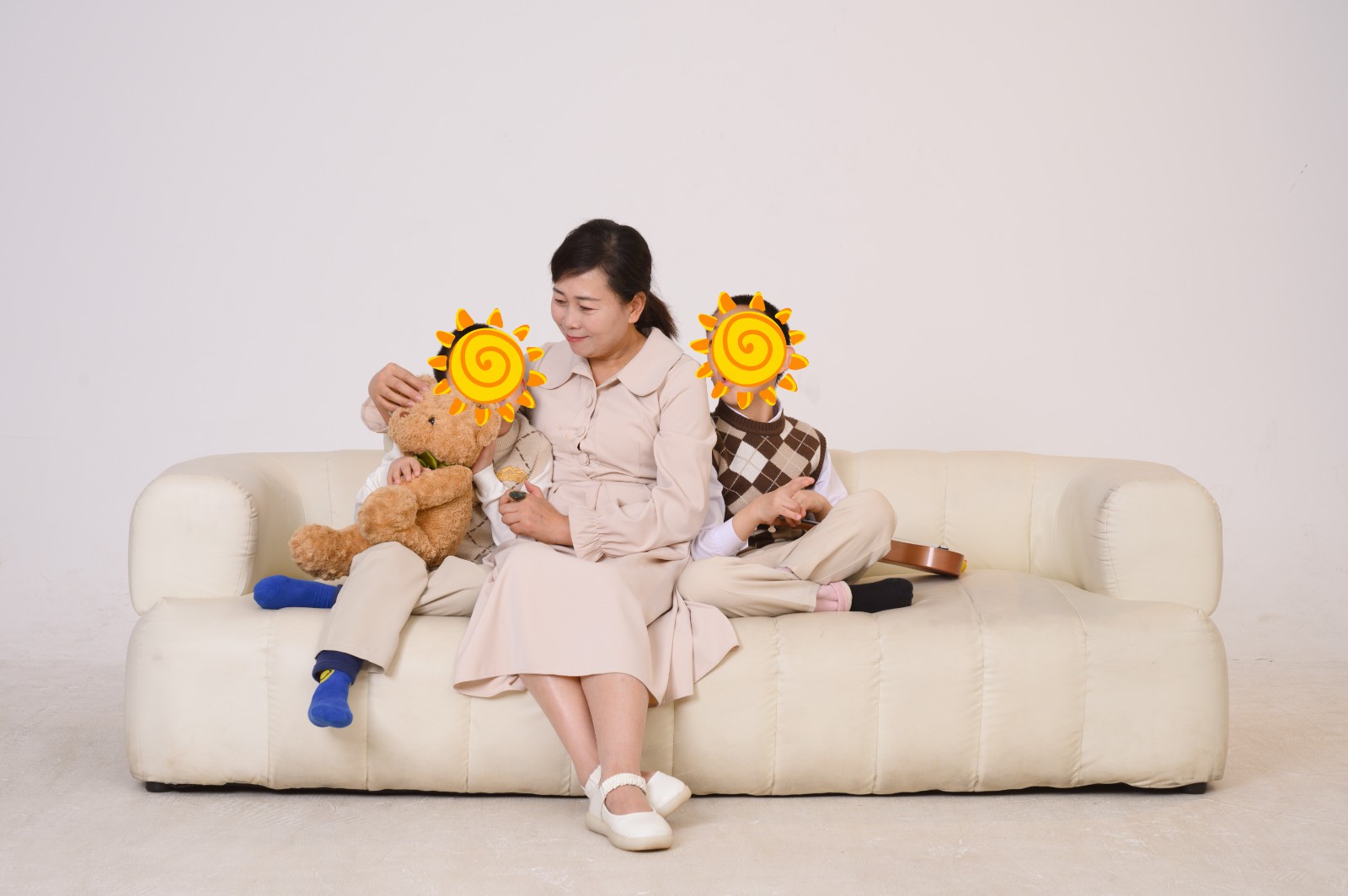 攝影師悉心指導(dǎo)著拍攝姿勢(shì),孩子們純真的笑容在鏡頭前盡情綻放。歡歡緊緊依偎在“家人”身旁,臉上滿是幸福。她與“爸爸媽媽”之間親昵的互動(dòng),每一個(gè)眼神的交匯、每一個(gè)小動(dòng)作,都傳遞出濃濃的親情,讓人幾乎忘卻了他們之間并無血緣關(guān)系。而那個(gè)小男孩,在“家人”的鼓勵(lì)下,也徹底放松了緊繃的神經(jīng)。此刻,他正把側(cè)臉輕輕貼在“爸爸”溫?zé)岬难股?,尋求著更多的安全感。“爸爸”則悄悄將掌心覆在孩子的后頸,動(dòng)作輕柔得如同呵護(hù)著世間最易碎的琉璃盞,每一個(gè)細(xì)微的動(dòng)作都飽含著深沉的愛。