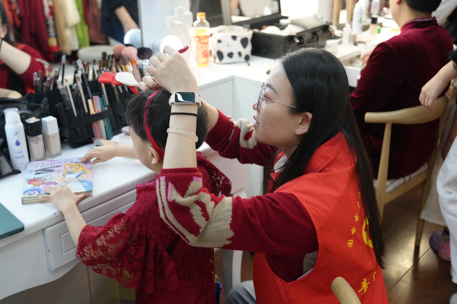 化妝鏡前,燈光次第亮起,志愿者舉著毛絨玩偶安撫緊張的孩子,小朋友執(zhí)意要給“媽媽”別上親手折的小紅花,粗糙的花瓣輕輕蹭過“媽媽”花白的鬢角,在燈光下,這份質(zhì)樸的禮物顯得格外動(dòng)人。整個(gè)攝影棚里都彌漫著靜謐而溫暖的氣息,仿佛時(shí)間都為這一刻停駐。