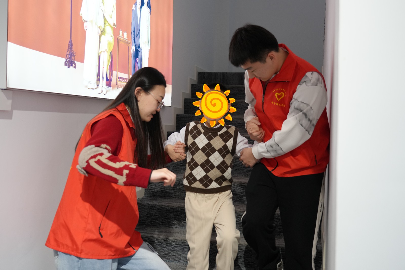 圖為志愿者在扶小朋友下樓