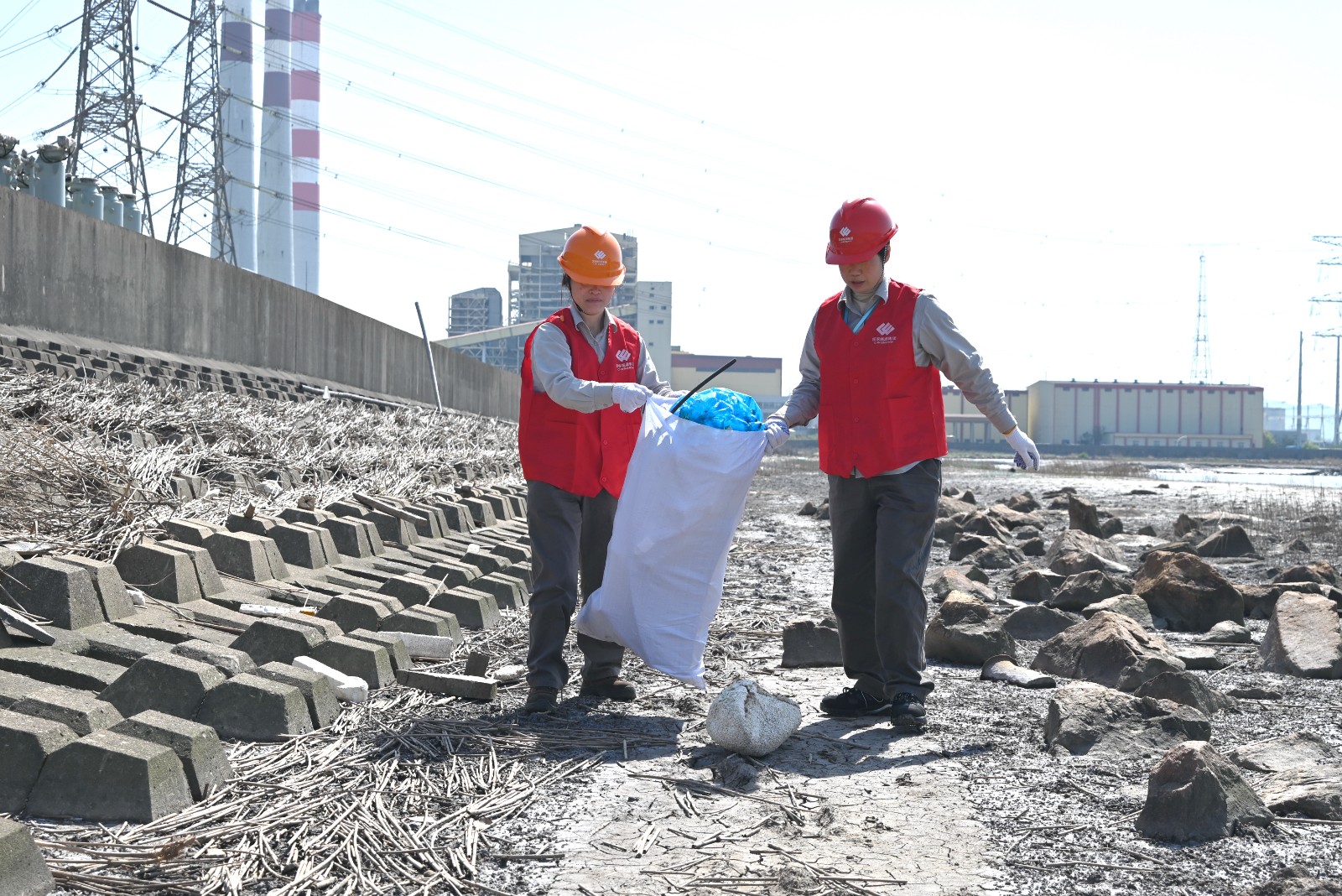 圖為浙江公司北侖電廠志愿者將垃圾打包帶走