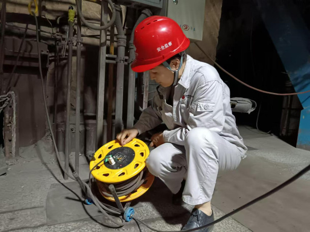 圖為霍宏正在查看外委施工作業(yè)現(xiàn)場(chǎng)使用的電纜盤是否檢測(cè)合格