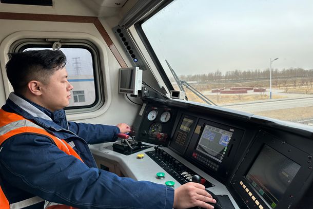在內(nèi)蒙古甘其毛都口岸的萬南金泉折返所,狂風(fēng)裹挾著沙粒,抽打著機車駕駛室的玻璃。機車乘務(wù)員張慶崗熟練地調(diào)整著列車運行速度,目光緊盯前方蜿蜒的鐵軌。這里,是中蒙煤炭運輸?shù)年P(guān)鍵樞紐。