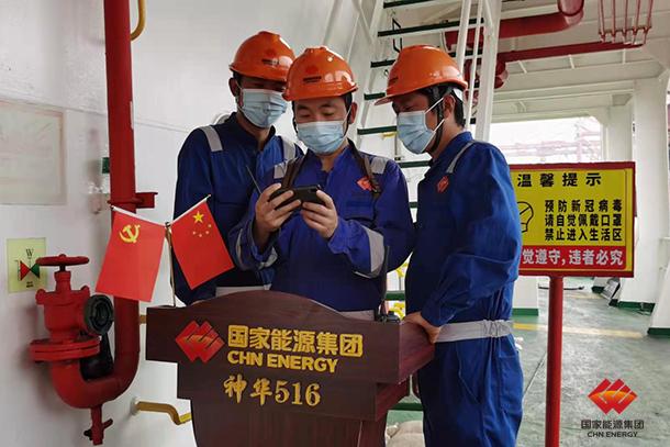 航運(yùn)公司神華516輪船員在南京港天辰碼頭收看慶祝中國(guó)共產(chǎn)黨成立100周年大會(huì)盛況