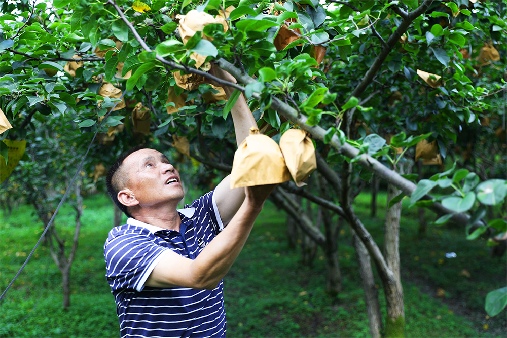 圖為徐源村村民陸紅發(fā)正在自家種植的雪梨地里忙著摘雪梨。